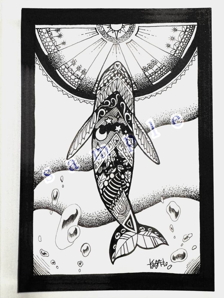 「海から山へ、クジラは天から恵む。」 はがきサイズの原画です。 額縁は別途お買い求めください。