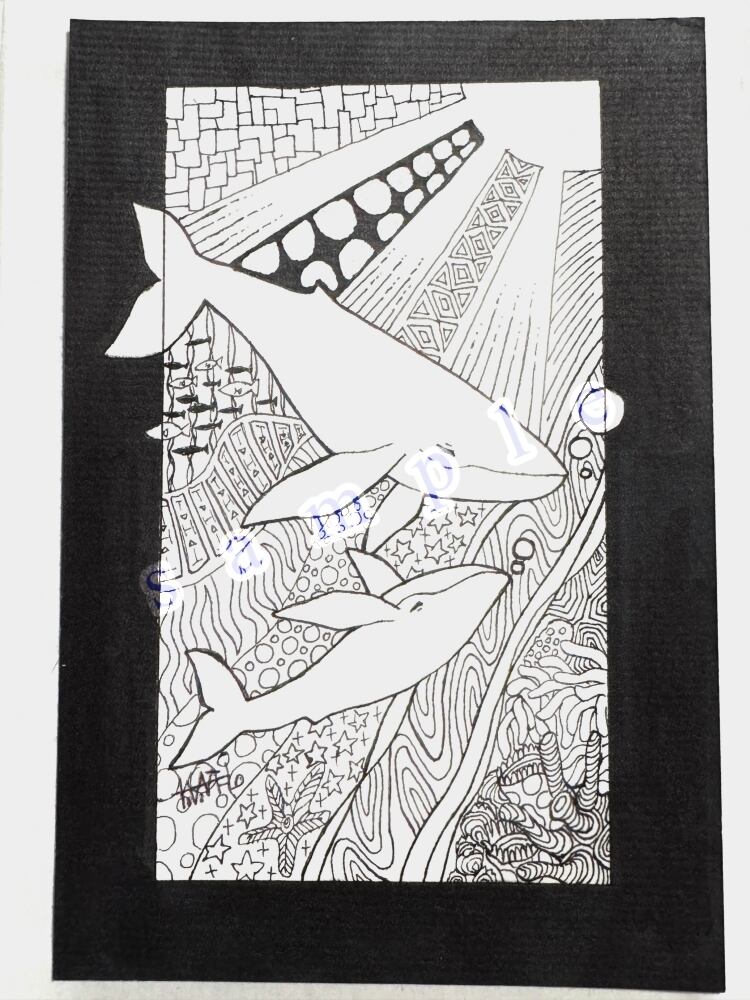 クジラの親子モチーフ。 はがきサイズの原画です。 額縁は別途お買い求めください。